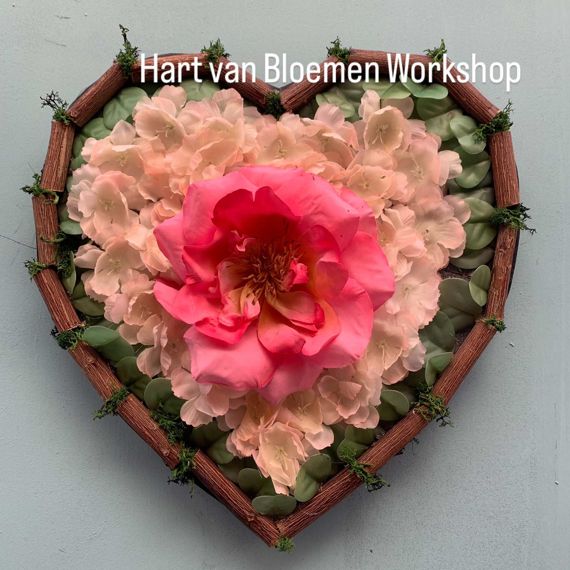 WORKSHOP: Hart van Bloemen, op een ondergrond die je kunt ophangen, ga je aan de slag met kunst/zijden bloemen en blad en nog andere materialen. Met een lijmpistool zet je alles vast. De keuze van materialen is aan jou, net als natuurlijk de kleuren en hoeveelheid van bloemen.