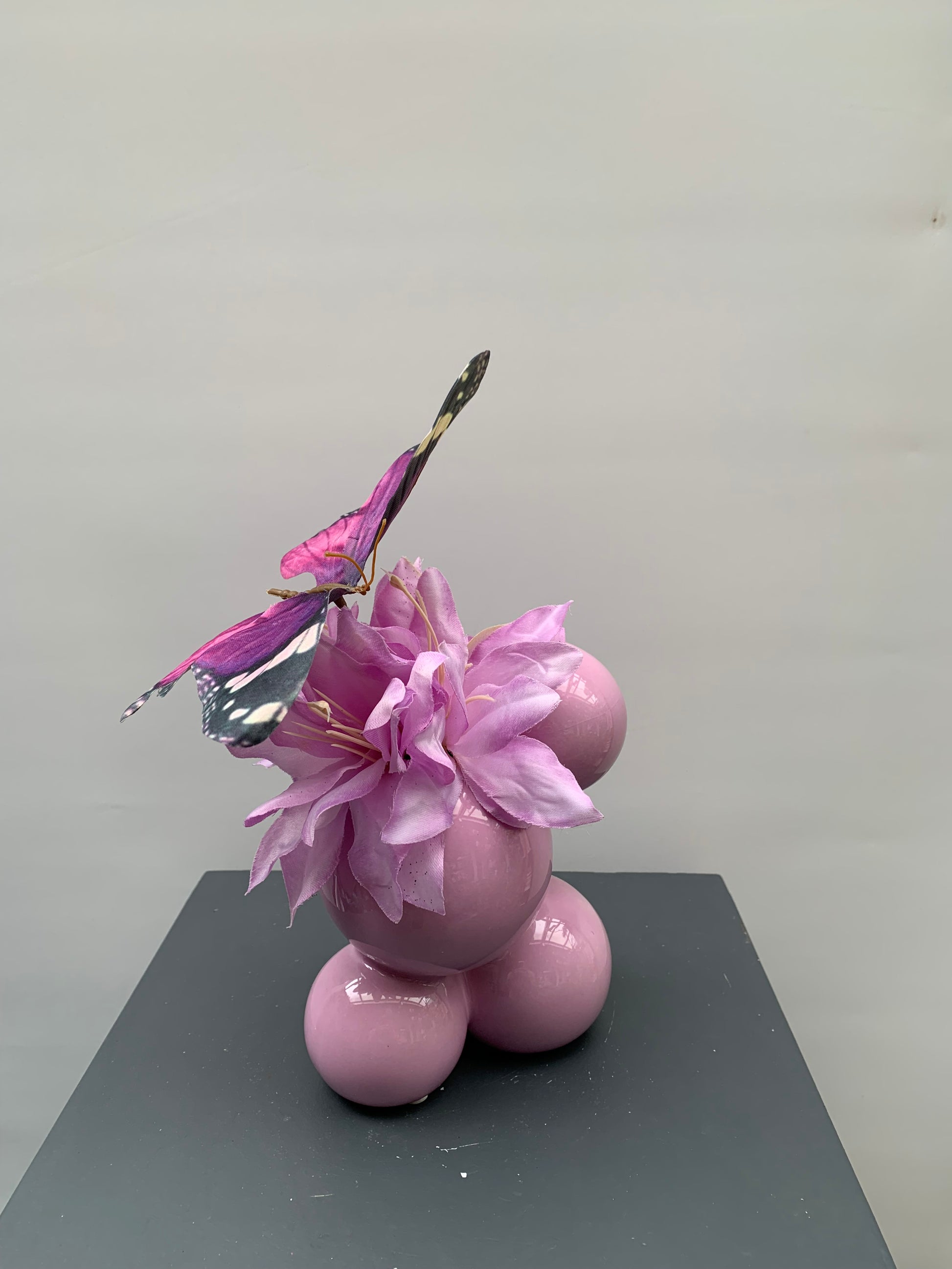Een grappig vaasje bestaande uit diverse bollen en opgemaakt met wat lila bloemen en een prachtige vlinder op kleur