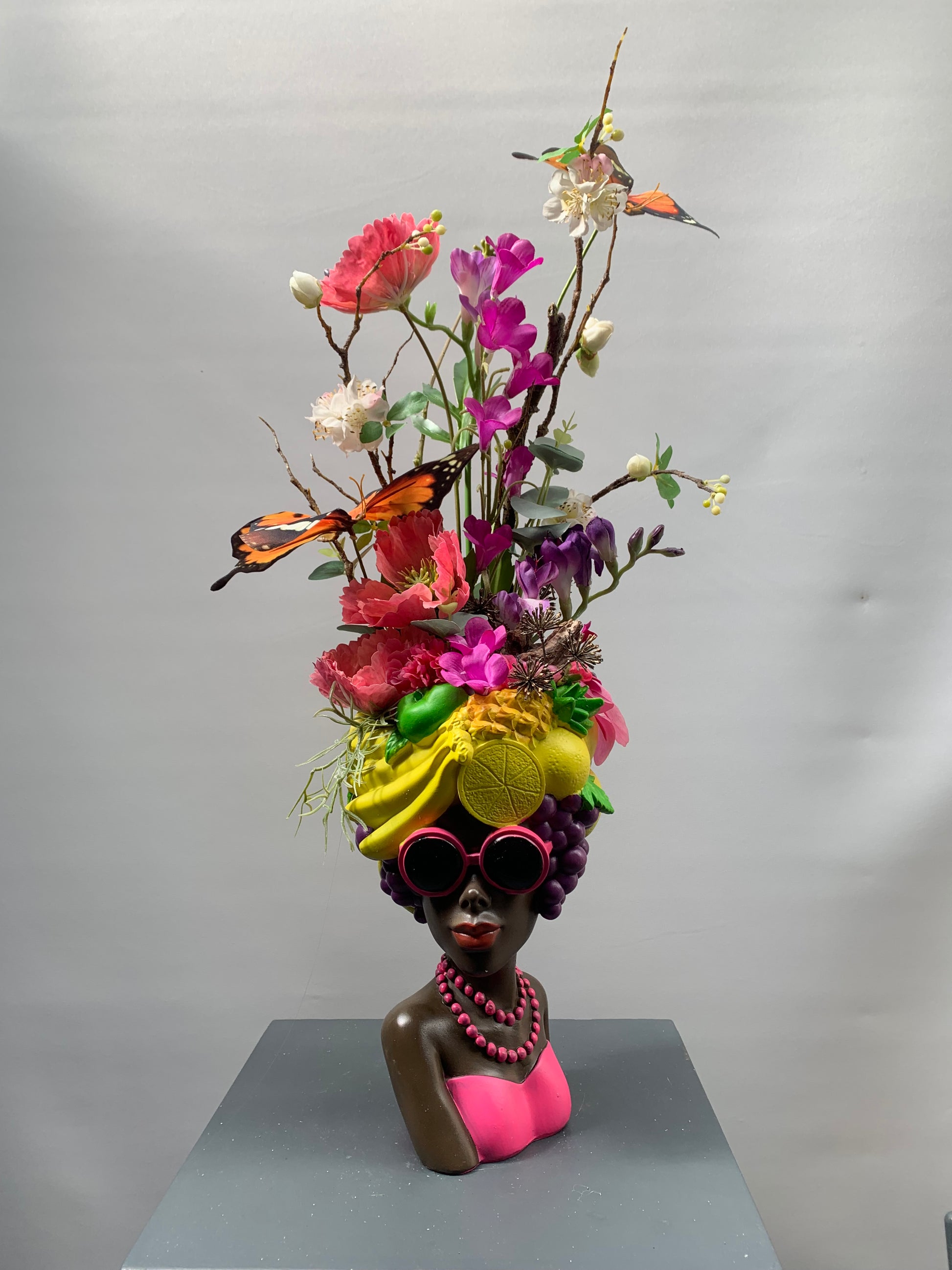 Een mooie dame die een creatieve compositie van bloemen meedraagt.