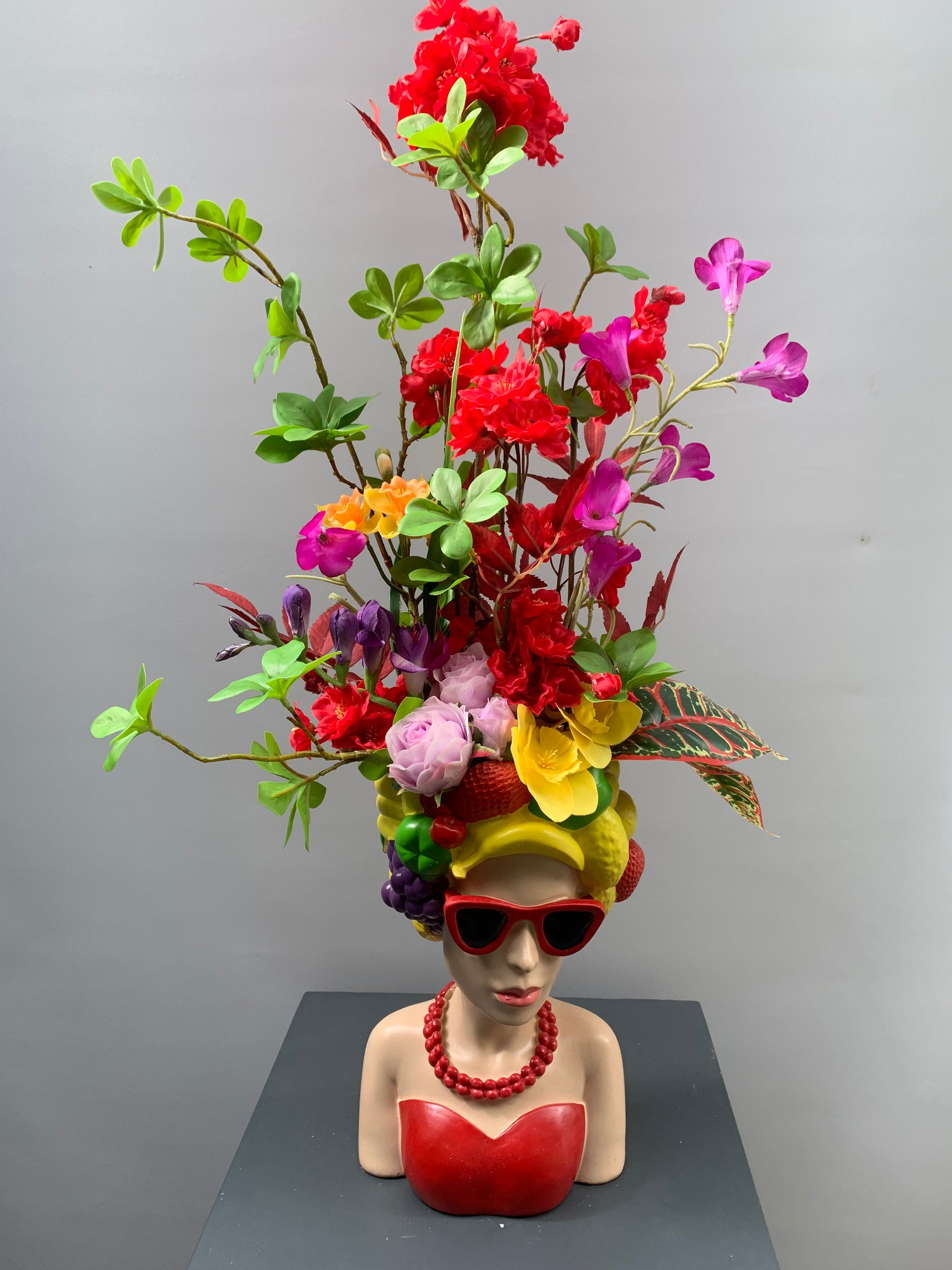 Een mooie dame die een creatieve compositie van bloemen meedraagt.