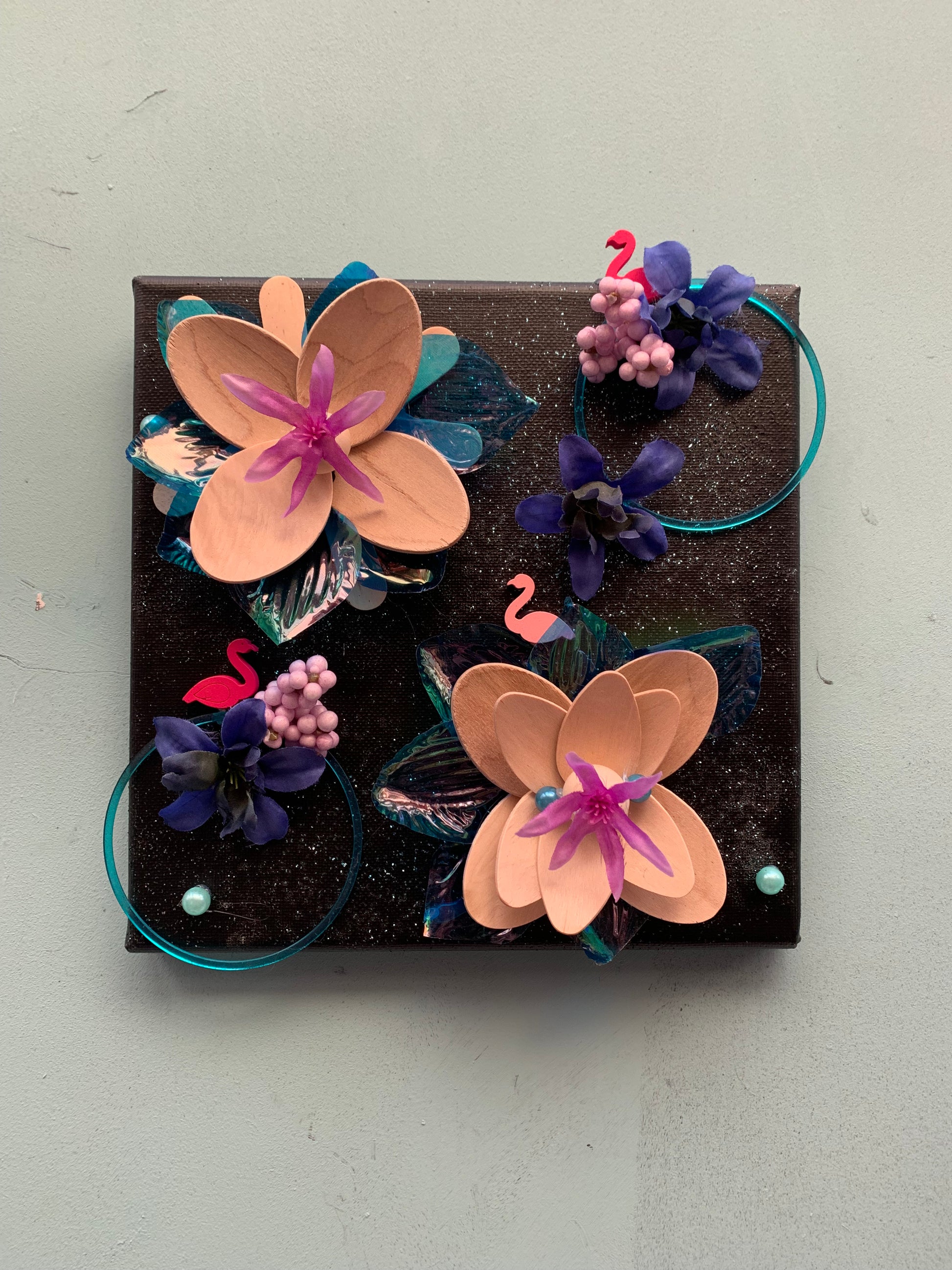 Op twee kleine schilderijlijstjes ga je aan de gang met stokjes, lepeltjes en zijden bloemen en andere creatieve materialen. Hier zie je dat ik de lijstjes zwart gespoten heb. Je kunt ze ook gewoon wit laten of zelf een spuitbus met je eigen kleur meenemen.